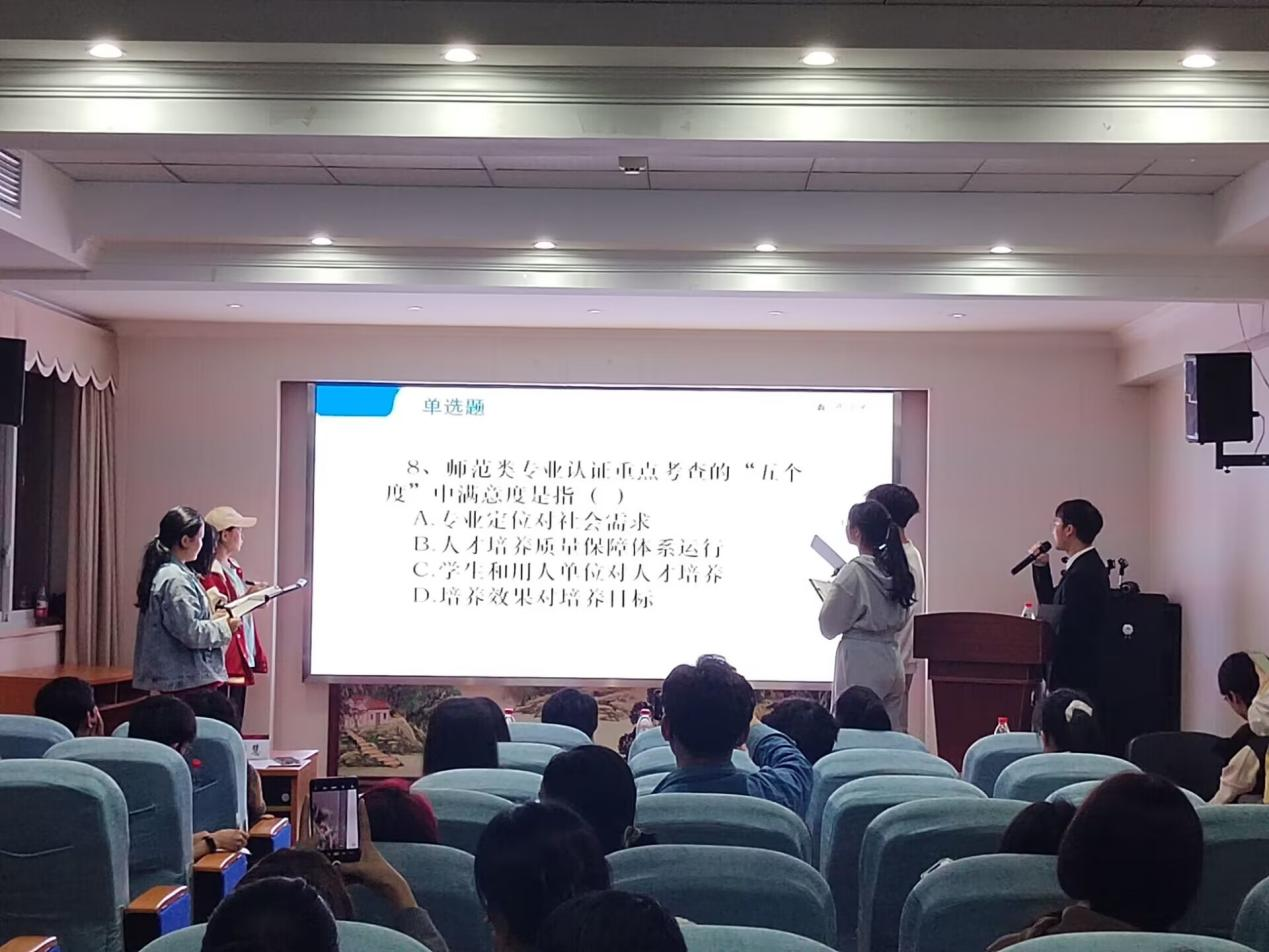 据悉,本次师范认证知识竞赛旨在通过“以赛促学”方式,调动学生对师范专业认证知识学习的积极性,锻炼学生团结协作的优良品质,在全院范围内形成“人人关心认证,人人了解认证,人人参与认证,人人为师范类专业认证做贡献”的浓厚氛围,为接下来的师范专业认证工作提供了强有力的保障。