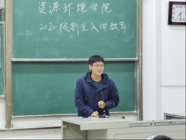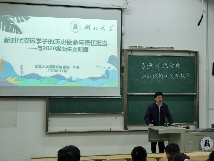 李明老师以《新时代资环学子的历史使命与责任担当——与2020级新生面对面》为题,从新时代“五位一体”总体布局出发,强调了生态文明建设上升为国家战略;从习近平总书记“绿水青山就是金山银山”的生态文明观出发,期望加深同学们对环境和经济的辩证认识;最后向同学们介绍了党的十九大对生态文明建设的蓝图描绘,号召大家从细微之处做起,坚持绿色价值取向、树立绿色思维方式、倡导绿色生活方式,细节之中践行绿色发展理念,共同撑起新时代生态文明建设的一片蓝天。