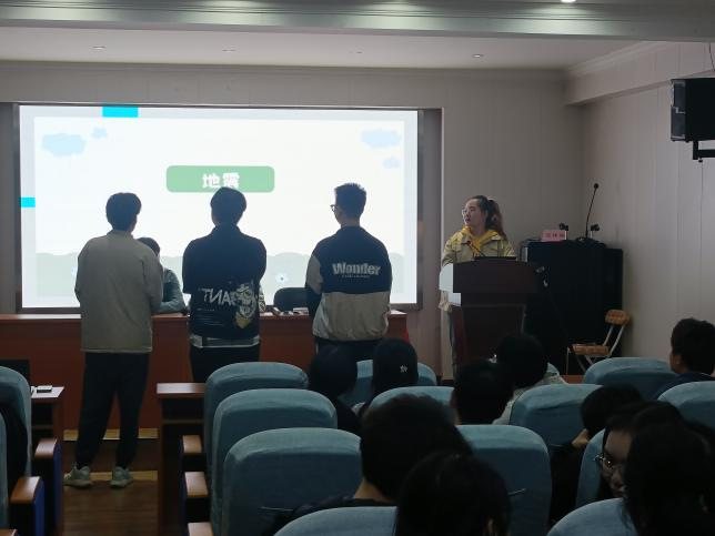 在大家情绪高涨之时,活动正式开始。第一个环节是“心有灵犀”,各小组按照出场顺序依次上台答题。你比我猜的题目全部与地球有关:泰国、地震、李四光、沉积岩......小组成员不能说出题目包含的字,他们绞尽脑汁,用最快的速度调动脑海里面的专业知识,配合肢体语言和组员配合,完成作答。