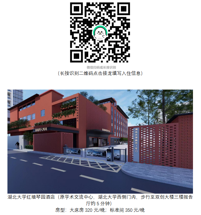 因近期会议较多,会务组提前在湖北大学红墙琴园酒店预留了部分标准间,费用由参会代表自付。请需要住宿的代表于2025年12月27日前扫描下方二维码提交住宿信息:
