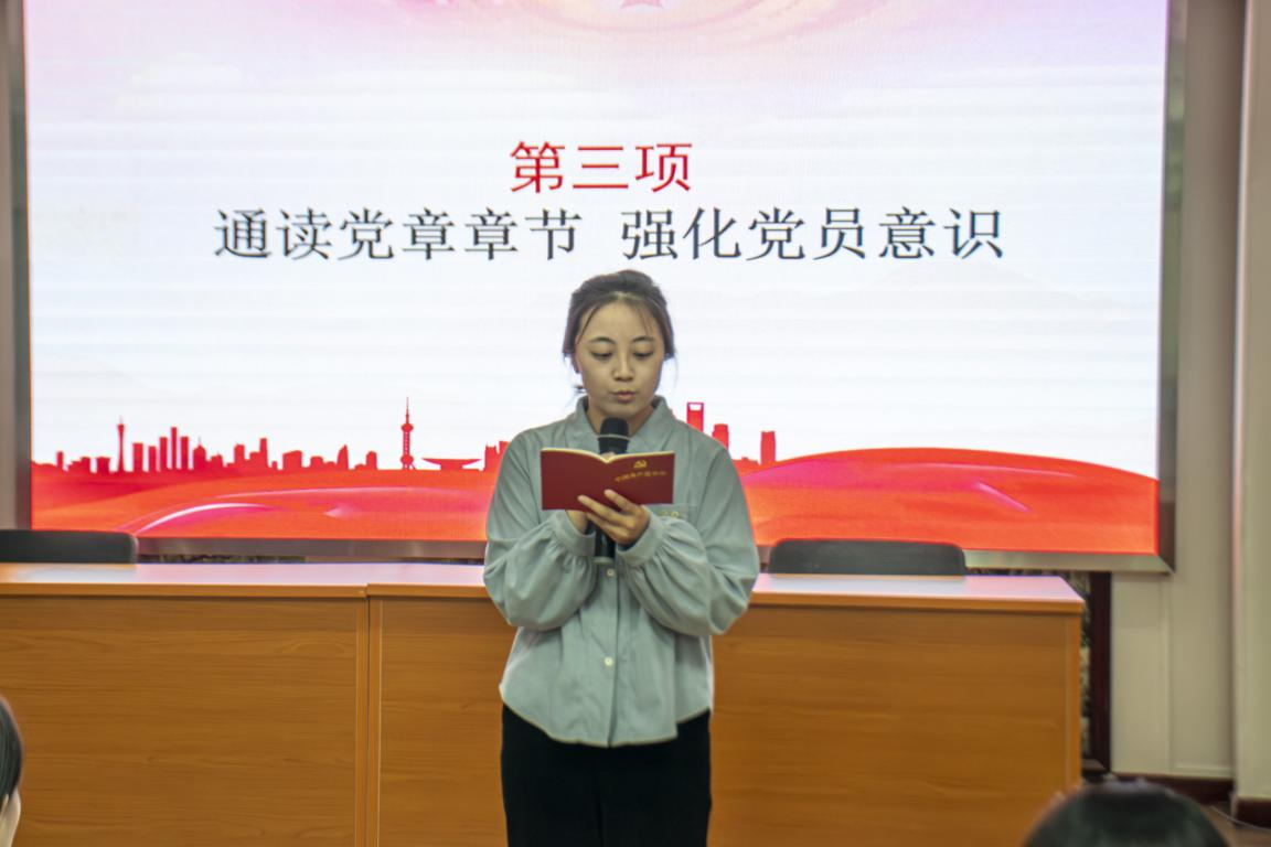 在党章学习环节,党员代表领读了党章总纲和第一章中关于党的领导、党员义务权利等重要内容,全体党员集体诵读了相关段落。
