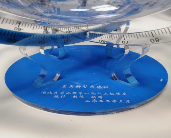 刘华新,1983年就读于湖北大学地理系,现为广东省佛山市顺德区第一中学高级地理教师,同时也是广东省天文学会理事之一。为表达对母校的感恩之情,反哺资环师生,刘校友花费四个月的时间亲自设计制作了这台天球仪,并以湖北大学地理系1983级校友名义捐赠,希望为母院的建设尽一份绵薄之力。