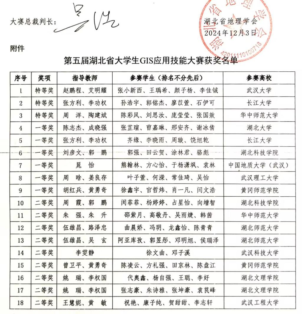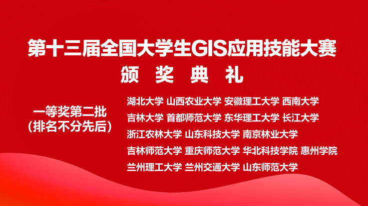 2024年11月9日,第五届湖北省大学生GIS应用技能大赛于武汉理工大学成功举办。11月22日-24日,第十三届全国大学生GIS应用技能大赛于兰州交通大学成功举办。我院陈志杰、成晓强老师指导的2022级地理信息科学专业学生团队(张芷瑄、曹嘉琳、邢安齐、谢冰倩)代表湖北大学参与了国省两赛,且均斩获了一等奖的优异成绩。