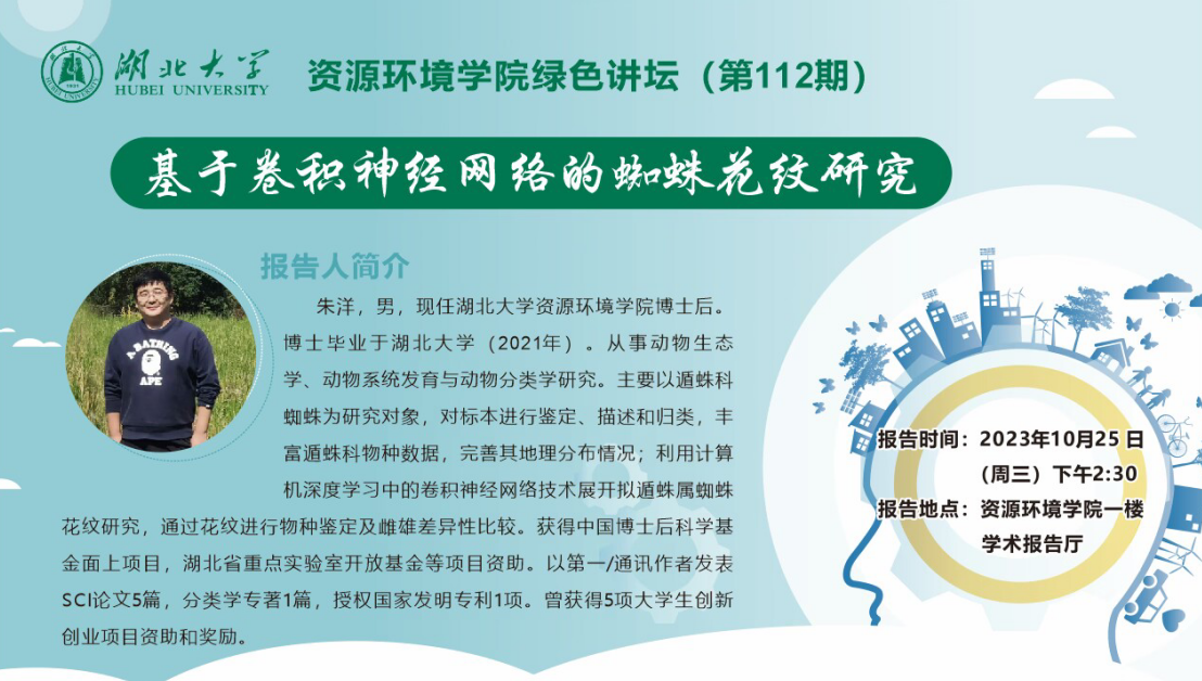 专家简介:朱洋,男,现任湖北大学资源环境学院博士后。博士毕业于湖北大学(2021年)。从事动物生态学、动物系统发育与动物分类学研究。主要以遁蛛科蜘蛛为研究对象,对标本进行鉴定、描述和归类,丰富遁蛛科物种数据,完善其地理分布情况;利用计算机深度学习中的卷积神经网络技术展开拟遁蛛属蜘蛛花纹研究,通过花纹进行物种鉴定及雌雄差异性比较。获得中国博士后科学基金面上项目,湖北省重点实验室开放基金等项目资助。以第一/通讯作者发表SCI论文5篇,分类学专著1篇,授权国家发明专利1项。曾获得5项大学生创新创业项目资助和奖励。