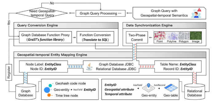 该项研究提出了一种地理时空语义查询优化方法,旨在解决图数据库和知识图谱中的地理时空数据建模与高性能语义查询的难题。知识图谱作为连接异构多模态数据的前沿技术,在GIS领域备受关注,但其在地理时空数据语义查询效率方面仍面临挑战。图数据库擅长处理复杂语义关联,却在拓扑分析和地理计算等任务中效率较低;而关系数据库虽在地理空间数据存储与计算上表现优异,却难以高效处理关联分析。为此,该方法整合了图数据库与关系数据库的优势,将完整的地理时空对象存储于关系数据库中(利用其内置或扩展的空间数据引擎),并通过时空分区和索引提升查询效率。同时,在图数据库中存储轻量化的地理时空节点,并通过多粒度时间树和Geohash编码节点构建索引关联,增强时空聚合能力。在查询过程中,用户请求被分解为图语义搜索和地理时空计算,分别下推至图数据库和关系数据库执行,并采用两阶段提交协议实现跨数据库数据同步。该团队基于PostGIS和Neo4j构建了该方法原型系统,并在真实大规模数据集上进行了性能评估与案例研究,结果表明,此方法将图数据库中的地理时空查询响应时间缩短了1-2个数量级,并能灵活支持多样化的时空分析需求,为知识图谱在地理时空数据处理中的高效应用提供了重要解决方案。