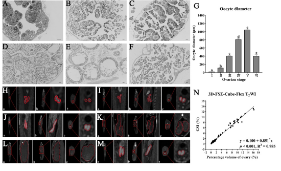 目前评估鱼类卵巢发育期状态的方法存在下述缺点:耗时长、不够准确和造成鱼类的死亡。磁共振成像(MRI)技术是一种快速、准确、无损的评估鱼类卵巢发育期状态的方法。然而,磁共振成像的传统序列(IDEAL T2和3D CUBE T1)在评估鱼类卵巢发育分期的过程中存在扫描时间较长的缺点(263秒),扫描时间过长会导致鱼类死亡率增加,亲鱼繁殖率降低。因此,需要一种能够快速、准确、无损的新序列用于评估鱼类的卵巢发育期状态。该研究通过磁共振成像采用新序列3D-FSE-Cube-Flex T2WI来评估乌醴(Channa argus)的卵巢发育期状态情况,并与两个传统序列(IDEAL T2和3D CUBE T1)作对比,同时结合组织学和性体比两种评估性腺成熟的金标准进行比较。该研究表明磁共振成像的3D-FSE-Cube-Flex T2WI是一种快速(140秒)、准确且无损的卵巢发育期状态评估方法,能够用于雌鱼卵巢全发育期状态的评估,在水产养殖和鱼类物种保护中具有巨大的应用潜力。
