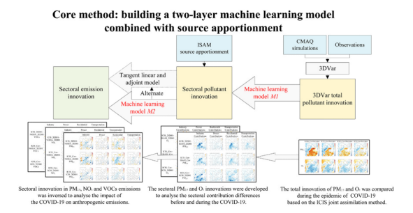 排放源的不确定性一直是空气质量模型模拟误差的主要来源之一。特别是在像COVID-19这样的重大公共卫生事件期间,人类活动的急剧变化对空气质量产生了显著影响。为了更准确地评估这些影响,需要发展高精度、高时空分辨率的且区分行业来源的排放源反演方法。本研究中,湖北大学资源环境学院黄丛吾讲师及其团队开发了一种结合三维变分和机器学习的行业排放源反演方法。该方法利用多尺度空气质量模型CMAQ,结合污染物来源解析技术ISAM,实现了对新冠疫情前后京津冀地区PM2.5和O3浓度的精确模拟和排放源反演,分析了新冠疫情对不同行业排放源及其对污染贡献的影响。