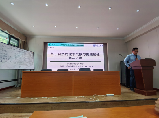 2025年10月24日,由湖北大学资源与环境学院主办的绿色讲坛第126期讲座顺利举行。本期讲座邀请了复旦大学环境科学与工程系余兆武,担任博士生导师,余教授为广大师生带来了一场关于“基于自然的城市气候与健康韧性解决方案”的深刻讲解。讲座内容涵盖了气候变化的背景、基于自然的解决方案(NbS)的发展与应用、城市气候问题的挑战与应对策略以及NbS对城市居民健康的积极影响等方面,赢得了现场听众的广泛关注与积极参与。