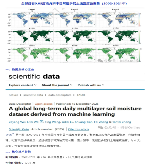 2026年1月4日,我院魏立飞教授团队在nature旗下SCI期刊《Scientific Data》上发表了题为“A global long-term daily multilayer soil moisture dataset derived from machine learning”的学术论文,湖北大学为第一完成单位,资源环境学院2023级生态学博士研究生魏泽阳为论文第一作者,魏立飞教授为通讯作者。该研究得到了国家自然科学基金项目、国家重点研发计划项目的资助。