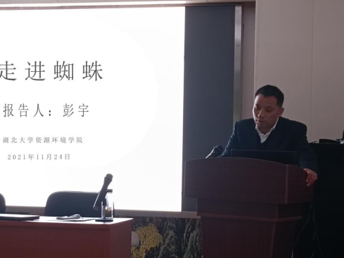 2021年11月24日下午3点,资源环境学院院长彭宇教授为我院师生做了题为《走进蜘蛛》的学术报告,该报告为我院绿色讲坛之学院团队报告系列的第二讲。报告由副院长赵丽娅教授主持,资源环境学院教师、研究生代表等一百余人在现场聆听讲座。