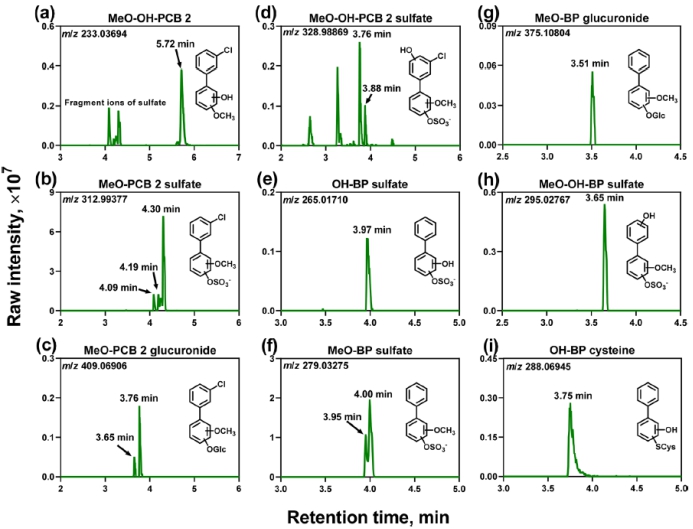 研究人员采用具有人体肝脏代谢功能的人肝癌细胞HepG2)和人肝微粒体作为研究模型,以低氯取代的PCB 23-氯联苯)为研究对象,利用基于高分辨质谱的非靶标分析技术在PCB 2暴露后的HepG2细胞培养液中鉴定了超过20PCB 2的代谢产物,包括目前还未在人源细胞模型研究中引起注意的脱氯代谢产物(图2)。同时,人肝微粒体的研究结果表明PCB 2的脱氯与邻位的羟基化代谢产物(OH-PCBs)的产生有关。另外,研究人员采用非靶向代谢组学技术,鉴定了与PCB 2暴露相关的内源性代谢物及代谢通路变化,如与胆固醇代谢相关的胆汁酸生物合成通路等。该研究较为全面地在体外水平鉴定了PCB 2的代谢产物及其暴露所引起的内源性代谢组响应,为理清PCBs在人体内的代谢网络以及在肝细胞内毒性作用靶标提供了重要基础。