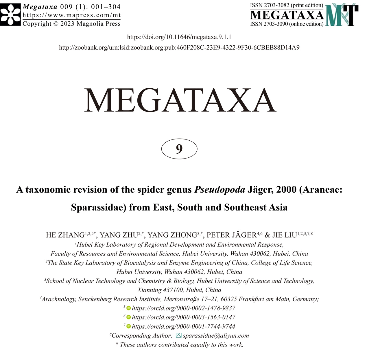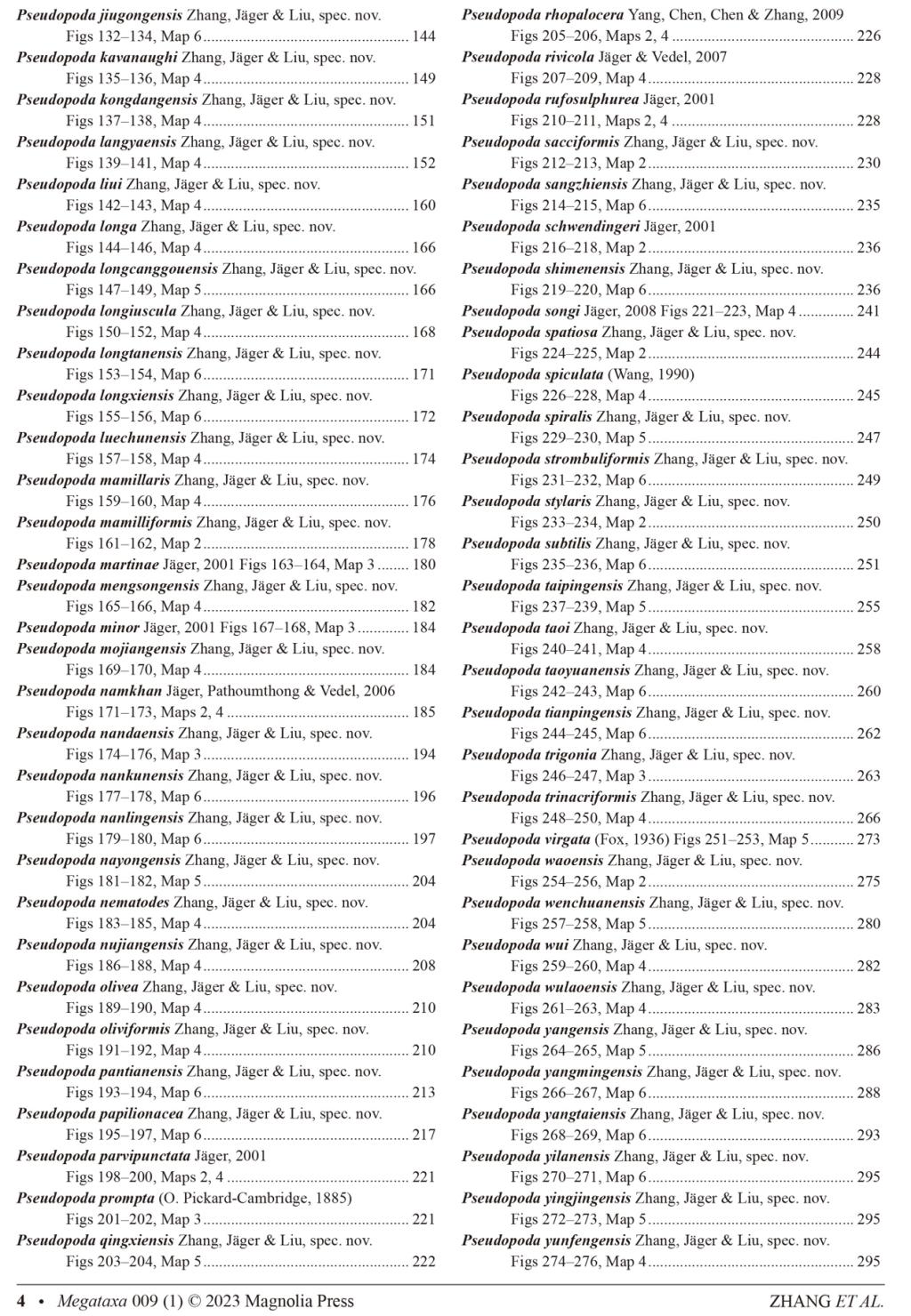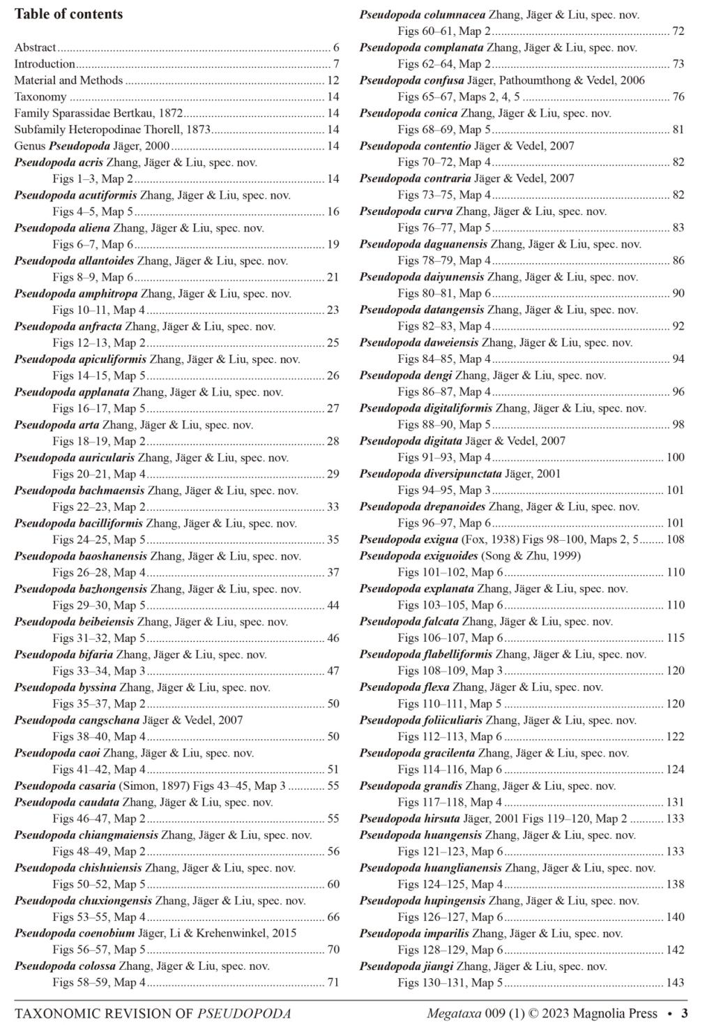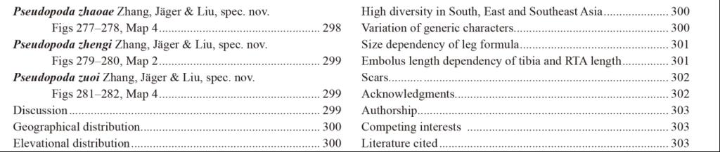 2023年2月17日,源环境学院刘杰教授团队在Megataxa刊发了题为“A taxonomic revision of the spider genus Pseudopoda Jäger, 2000 (Araneae: Sparassidae) from East, South and Southeast Asia”的文章,对巨蟹蛛科拟遁蛛属Pseudopoda的122种蜘蛛进行了修订性研究,其中包括新种99个!全文共304页,共有鉴定图版282张,分布地图6幅。