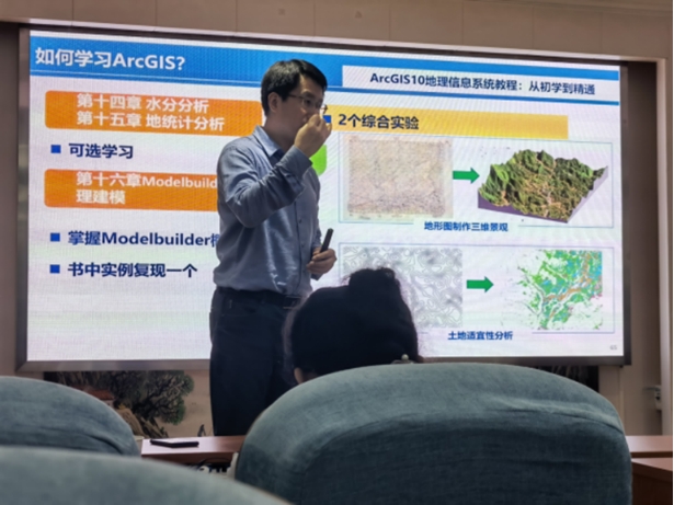 牟乃夏教授以“GIS专业与就业”为题向同学们介绍了GIS技能大赛的相关事项、GIS的学习方法以及该专业今后的就业方向。他详细地介绍了全国大学生GIS技能大赛的流程、试题和要求等,强调“文档第一、细节第一”,讲述了文档地书写格式以及内容要求;介绍全国大学生GIS应用技能大赛的能力要求——空间数据的采集编辑与集成处理能力、空间分析技术的应用与系统设计能力等;为同学们展示了他本人所指导的团队的获奖成果,让同学们对学科竞赛有了更清晰的认识和理解。牟乃夏教授同时勉励同学们,要找到自己学习的目标,还要有宽阔的视野,要关注并了解当前行业的未来发展方向,让自己不断获得成长,适应新的社会要求。