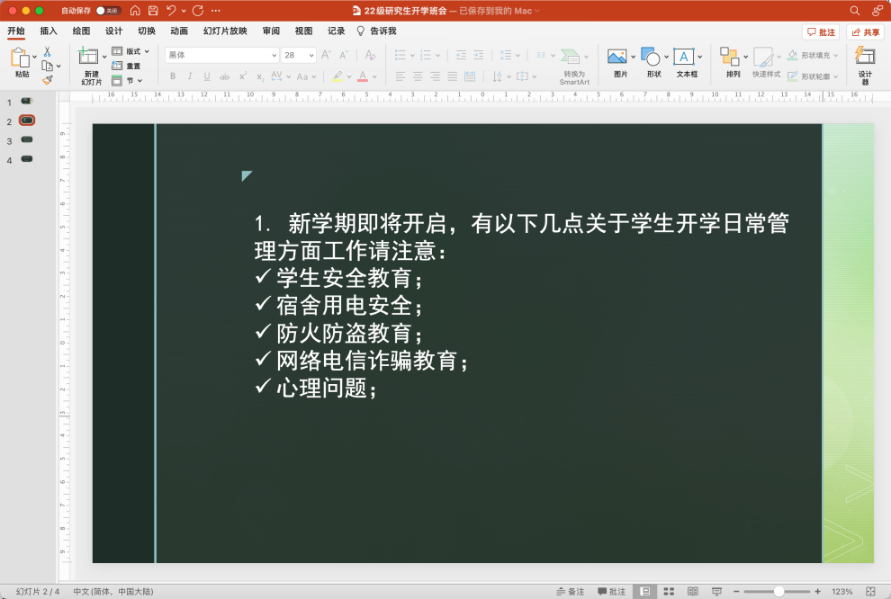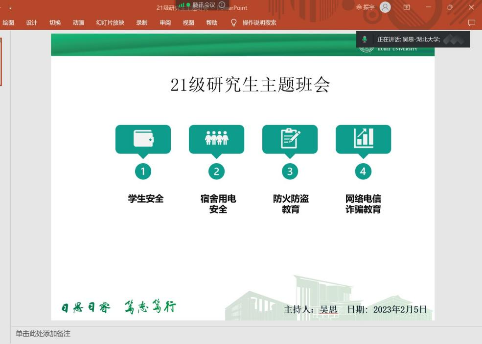 三位老师主要向同学们强调宿舍安全教育、防火防盗教育、网络电信诈骗教育、心理健康教育等方面,着重关心学生身体健康,提醒学生做好健康监测,不要带病进行实验和实习。并宣讲因新冠患病等原因导致经济困难的学生,可申请临时困难补助的政策。