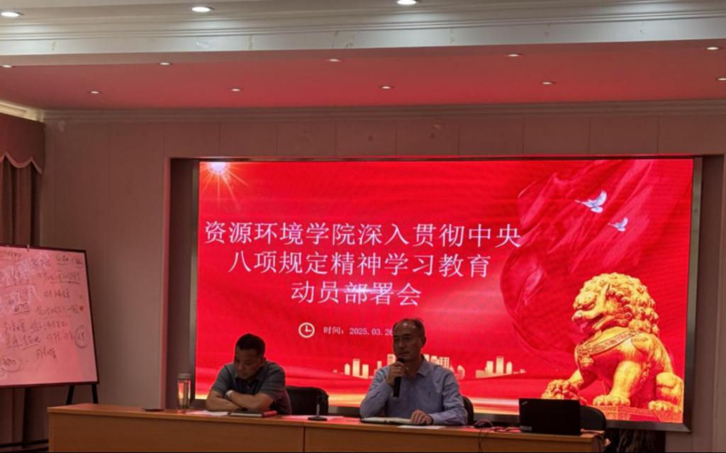 为深入贯彻中央八项规定精神,进一步强化学院党风政风建设,资源环境学院于3月26日在学院一楼报告厅召开专题学习教育动员部署会。会议由学院党委书记黄月辉主持,学院领导、全体教职工参会。